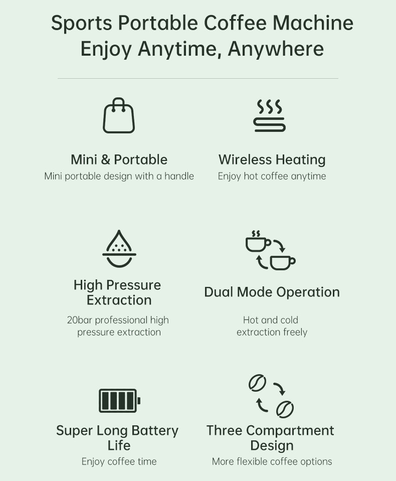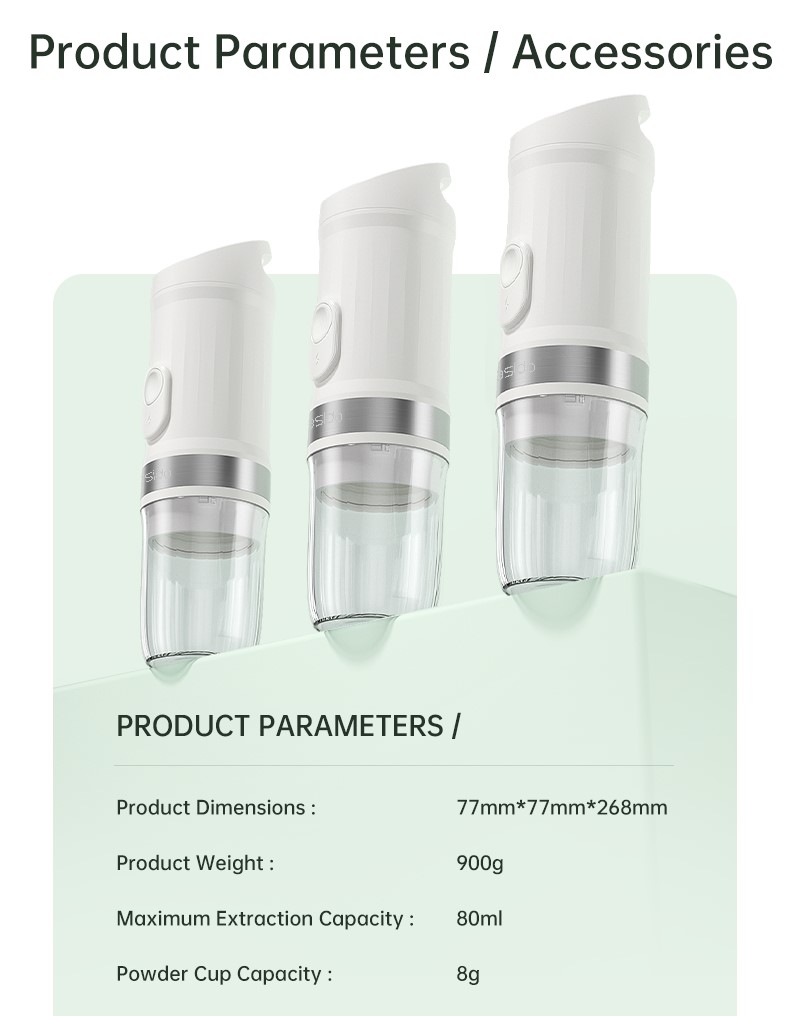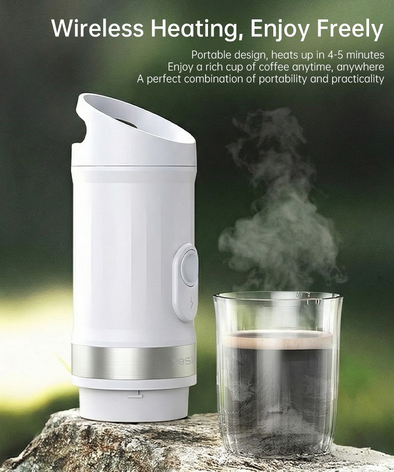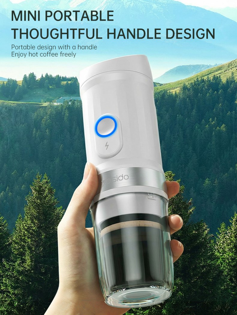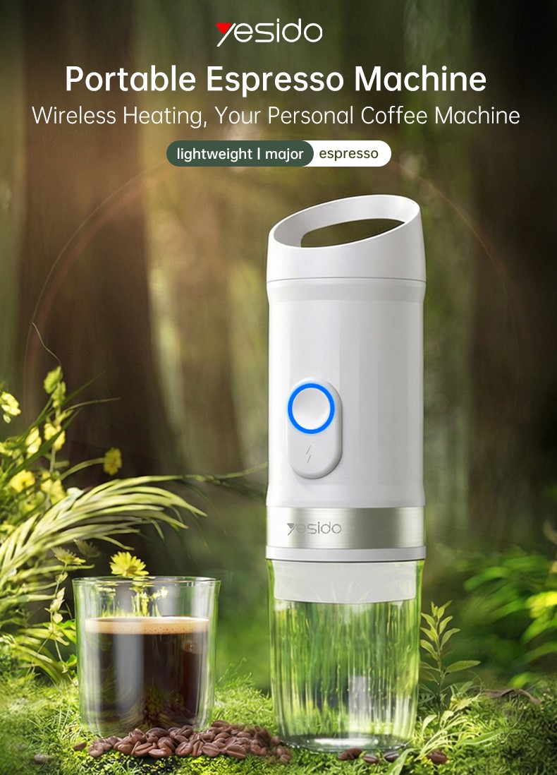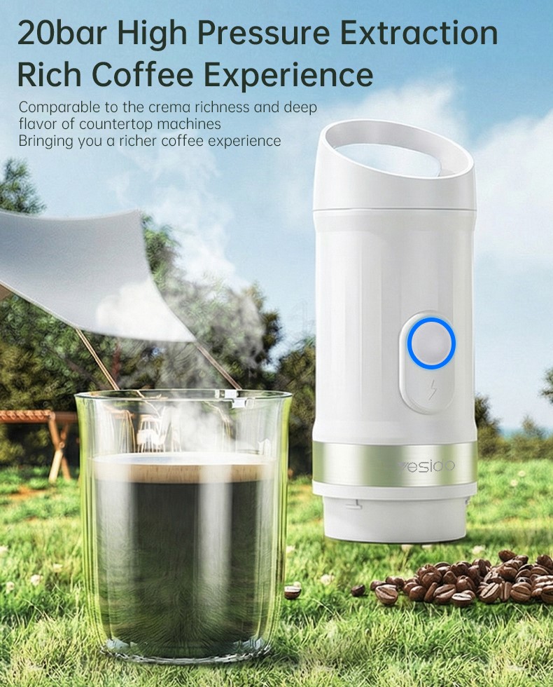 Nešiojamasis kavos aparatas YESIDO EC30 yra kompaktiškas, baterijomis maitinamas kavos aparatas, skirtas naudoti namuose, biure ir lauke. Integruota aukšto slėgio 20 BAR ekstrakcijos sistema kuri išsiskiria sodriu kavos paruošimu ir stipriu paruoštos kavos aromatu, kad galėtumėte paruošti kavinės kokybės kavą bet kada ir bet kur.