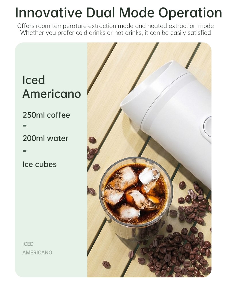 Nešiojamas kavos aparatas Yesido EC30 yra universalus 2-in-1 įrenginys, skirtas tiek kapsulėms, tiek maltai kavai. Dėl novatoriškos karštos ir šaltos kavos ekstrakcijos technologijos galite mėgautis sodria espreso arba gaivinančia šalta kava bet kada ir bet kur. Galingas variklis užtikrina greitą ir tolygų malimą, o kompaktiškas dizainas puikiai tinka naudoti namuose, biure ar lauke. Pagamintas iš patvarių medžiagų ir nuimamų dalių, jis sujungia našumą, stilių ir patogumą viename elegantiškame aparate.
