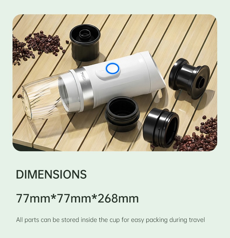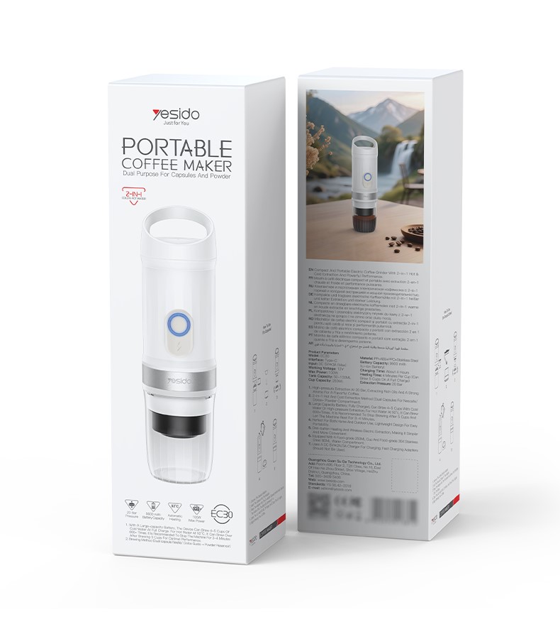 Kavos aparatas YESIDO EC30 2 in 1 karšto ir šalto ekstrakcijos metodas palaiko tiek „Nescafe“ / „Dolce Gusto“ kapsules, tiek kavos miltelius. Lengvas ir nešiojamas mini kavos aparatas EC30 turi vieno mygtuko šildymą, belaidę elektrinę ekstrakcijos sistemą ir didelę 9600 mAh bateriją, leidžiančią paruošti iki 4–5 puodelių vienu pilnu įkrovimu. Pagamintas iš patvarių medžiagų, įskaitant PP, ABS, PPO ir nerūdijantį plieną, kavos aparatas turi 250 ml puodelių ir 80 ml vandens skyrelį, todėl idealiai tinka kavos mėgėjams kelionėms, stovyklavimui, namams ir biurui.