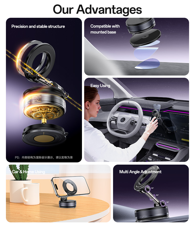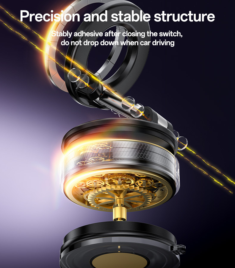 2. Stiprus magnetas: integruotas į magnetinio automobilinio telefono laikiklio pagrindą, užtikrinantį sandarumą ir stabilumą