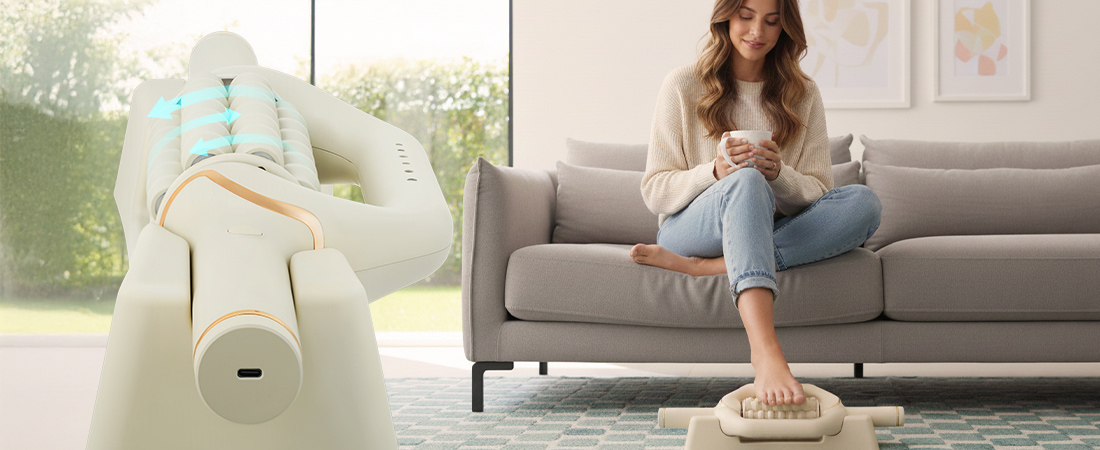 Komplekte yra stabilus pagrindas, leidžiantis naudoti masažuoklį nelaikant jo rankose. Tai leidžia masažuoti pėdas ar blauzdas sėdint, puikiai tinka dirbant prie stalo ar ilsintis namuose. Belaidis dizainas ir 4000 mAh baterija vienu įkrovimu užtikrina iki 120 minučių veikimo laiką, todėl galite jį naudoti bet kur.
