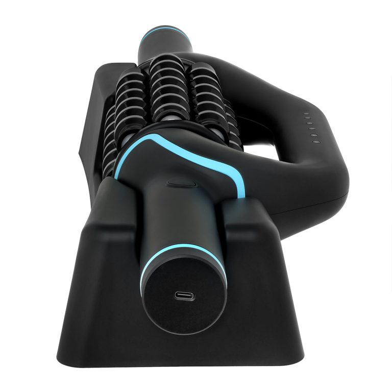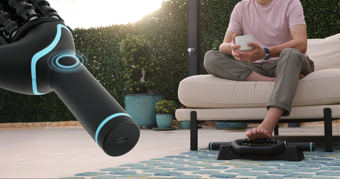 Komplekte yra stabilus pagrindas, leidžiantis naudoti masažuoklį nelaikant jo rankose. Tai leidžia masažuoti pėdas ar blauzdas sėdint, puikiai tinka dirbant prie stalo ar ilsintis namuose. Belaidis dizainas ir 4000 mAh baterija vienu įkrovimu užtikrina iki 120 minučių veikimo laiką, todėl galite jį naudoti bet kur.