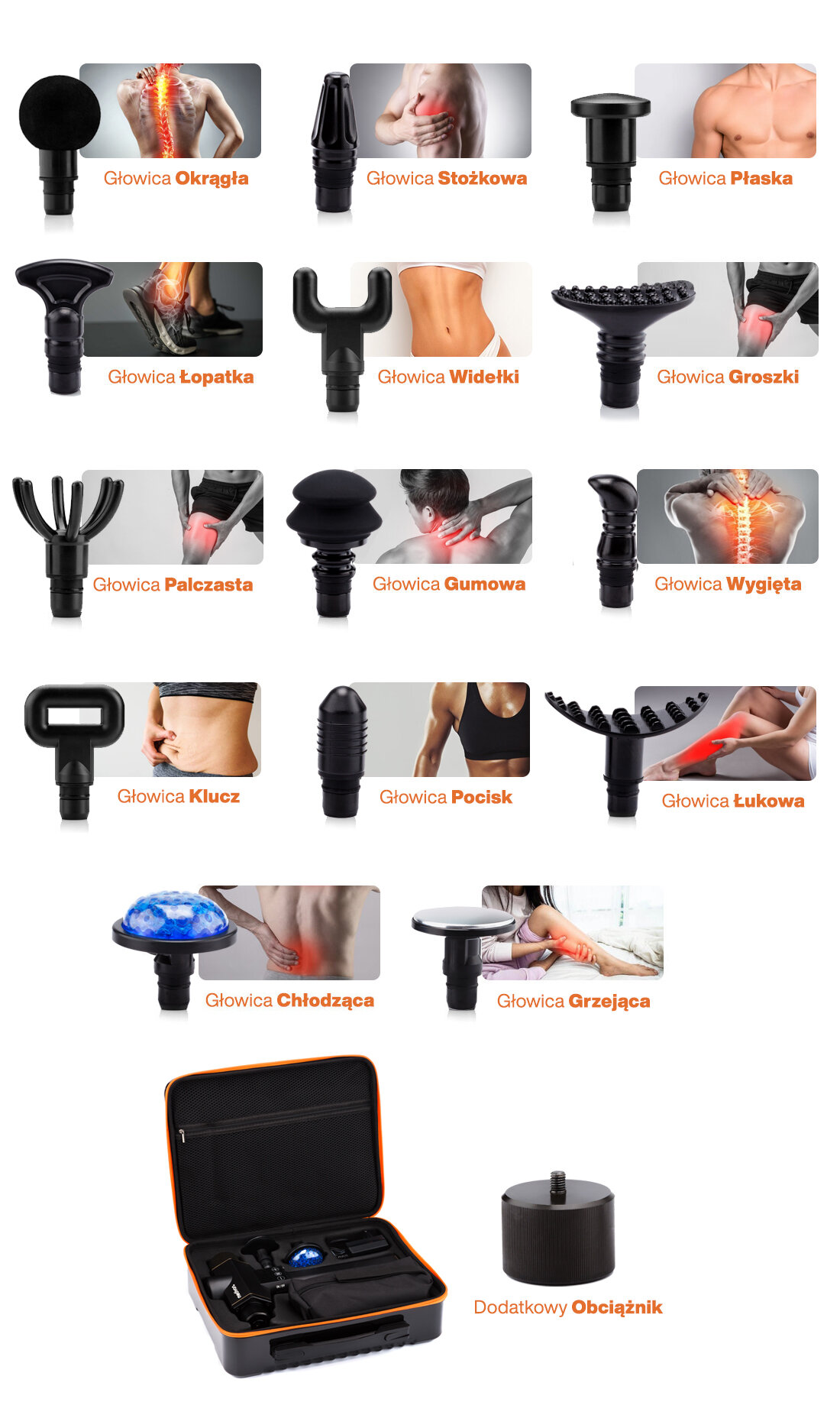 • Pirštų formos galvutė – rankoms, kojoms ir raumenims. Dėl daugybės sąlyčio taškų su kūnu ji puikiai tinka atpalaiduojančiam masažui. Ji taip pat tinka šildančiam masažui. • • •Guminė galvutė – tinka sąnarių ir didelių raumenų masažui, naudojama labai švelniam labiausiai įtemptų raumenų grupių masažui po intensyvaus fizinio krūvio ir atpalaiduojančiam masažui.